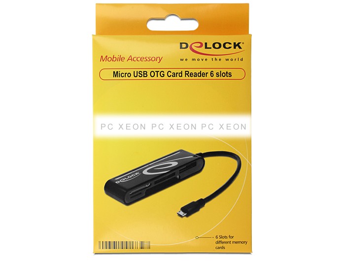 El lector de tarjetas de Delock permite realizar operaciones de lectura y escritura en tarjetas de memoria a través del puerto OTG Micro USB de su tableta o teléfono inteligente.